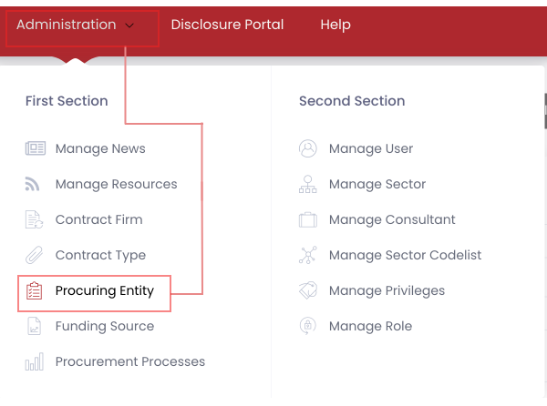- In the First Section of the Dropdown Menu, Click on the Procurement Entity to access the procurement entity form.